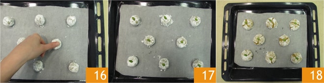 placez-les sur une plaque recouverte de papier sulfurisé. Laissez-les un peu espacées car elles gonfleront pendant la cuisson. À ce point, faites une légère pression avec le doigt sur chaque boule 16, pour les aplatir légèrement. Insérez dans chaque biscuit une pistache entière 17 et faites cuire dans un four statique préchauffé à 180° pendant 15 minutes, sur la grille du milieu du four. Une fois cuits, sortez les biscuits à la pistache du four 18 et laissez-les refroidir à température ambiante avant de les déguster.