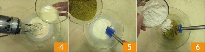 Ajoutez le beurre fondu, à température ambiante, en gardant le fouet à faible vitesse 4. À ce stade, ajoutez la farine de pistache petit à petit 5, en mélangeant délicatement avec une spatule. Dès qu'elle est bien incorporée, ajoutez la farine 00, la fécule 6.