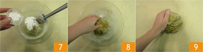 et la levure, petit à petit tout en continuant à mélanger avec la spatule 7. Quand la pâte commence à devenir assez solide, commencez à la travailler avec les mains 8, en la transférant sur le plan de travail 9.