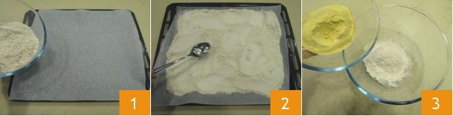 Pour préparer les biscuits à la quinoa et au chocolat, commencez par toaster la farine de quinoa : versez-la dans un plat rectangulaire recouvert de papier cuisson 1 en la répartissant bien avec une cuillère pour créer une couche fine et uniforme 2. Toastez la farine de quinoa à 80°C four statique pendant 2 heures : cette opération permet d'éliminer l'arrière-goût légèrement amer propre à cette farine sans gluten. Une fois le temps de toastage écoulé, laissez refroidir la farine de quinoa et transférez-la dans un grand bol avec la farine de maïs 3.