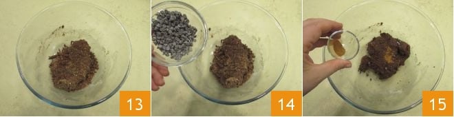 Mélangez avec les mains pour compacter la pâte 13 et ajoutez également les pépites de chocolat 14 et la cannelle en poudre pour une touche épicée 15.