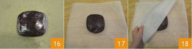 Aplatissez légèrement le bloc de pâte et enroulez-le de film plastique 16 ; laissez-le reposer au réfrigérateur pendant environ 30 minutes. Ensuite, placez-le sur une feuille de papier cuisson 17 et disposez dessus une deuxième feuille de papier cuisson 18.