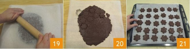 Étalez la pâte entre les deux feuilles de papier cuisson 19 en ajoutant, si nécessaire, un peu de farine de maïs pour éviter qu'elle ne colle pendant le travail. Obtenez une feuille d'environ 6 mm d'épaisseur et avec un emporte-pièce, découpez des petits biscuits en forme de fleur (ou ronds si vous préférez) d'environ 5 cm de diamètre 20. Avec ces doses, vous obtiendrez environ 30-32 biscuits. Disposez-les maintenant sur une plaque avec du papier cuisson 21.