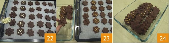 Pour une touche supplémentaire, vous pouvez décorer la surface des petits biscuits à la quinoa avec des pépites de chocolat noir ou blanc 22. Faites cuire les biscuits dans un four statique préchauffé à 180°C pendant 15 minutes, ou dans un four ventilé pendant 10-12 minutes à 160°C. Laissez refroidir les biscuits à la quinoa et au chocolat avant de les transférer sur un plateau et de les servir (23-24) !