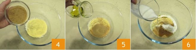 Ajoutez le sucre de canne brut 4, puis l'huile d'olive extra vierge 5 et le lait de riz à température ambiante 6.