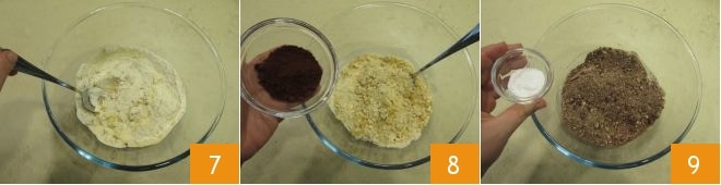Mélangez avec une cuillère 7, puis ajoutez le cacao amer 8 et la levure chimique 9.