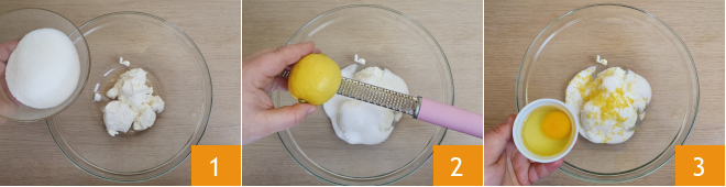 Pour préparer les biscuits à la ricotta, commencez par la pâte. Tamisez la farine et la levure dans un bol. Dans un autre, versez la ricotta et le sucre 1, parfumez avec le zeste de citron râpé 2, ajoutez l'œuf 3