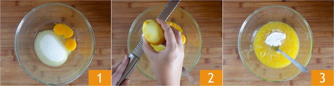 Pour préparer les biscuits à tremper, versez le sucre et les œufs dans un bol 1, puis parfumez avec le zeste de citron 2. Ajoutez également l'huile et mélangez avec une cuillère pour amalgamer, puis incorporez la levure 3.