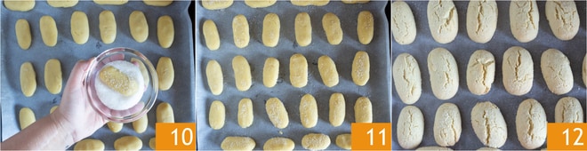 Passez chaque biscuit dans le sucre semoule 10 et placez-les au fur et à mesure sur une plaque recouverte de papier sulfurisé 11. Faites cuire les biscuits dans un four statique préchauffé à 180°C pendant 15-18 minutes. Sortez-les du four et laissez-les refroidir complètement avant de les déguster 12 !