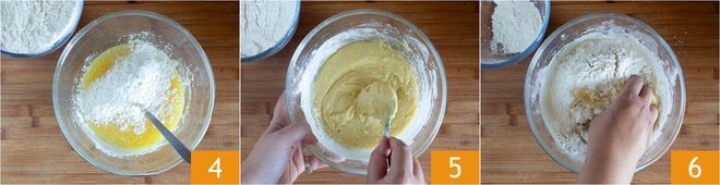 Incorporez la farine petit à petit 4, en mélangeant jusqu'à ce qu'elle prenne consistance 5, après quoi commencez à pétrir avec les mains 6.