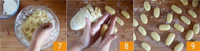 Pétrissez jusqu'à obtenir une pâte douce et non collante 7. Formez les biscuits : prenez un morceau de pâte et donnez-lui la forme d'un petit pain 8. Aplatissez légèrement les petits pains 9 : avec ces doses, vous obtiendrez environ une trentaine de biscuits.