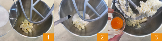 Pour préparer les biscuits au beurre, commencez par mettre le beurre froid dans le bol du robot pâtissier, équipé du crochet feuille. Ajoutez le sucre 1, une pincée de sel, les graines de la gousse de vanille 2 et mettez l'appareil en marche pendant quelques secondes. Lorsque le beurre est ramolli, ajoutez le jaune d'œuf 3 et mélangez pendant environ une minute.