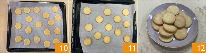 Après avoir formé les biscuits, disposez-les sur une plaque recouverte de papier sulfurisé, en les espaçant légèrement les uns des autres 10. Faites cuire au four statique à 170°C pendant environ 15 minutes 11, puis sortez-les du four et laissez refroidir. Vos biscuits au beurre sont prêts à être dégustés 12!
