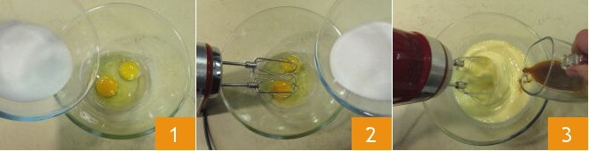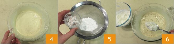 Le mélange doit être bien amalgamé 4. Tamisez la farine, la fécule et la levure à travers un tamis 5 et incorporez-les à la préparation une cuillère à la fois 6. Mélangez avec le batteur à basse vitesse.