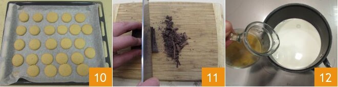 Faites cuire les biscuits dans un four statique préchauffé à 180° pendant 10 minutes. Faites cuire une plaque à la fois en conservant la pâte à température ambiante. Une fois la cuisson terminée, sortez les biscuits du four et laissez-les refroidir 10. Pendant ce temps, préparez la crème : hachez le chocolat noir 11 et faites-le fondre au bain-marie ou au micro-ondes. Dans une petite casserole, chauffez la crème et le café fait avec la cafetière 12.