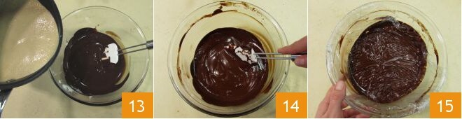 Lorsque le mélange atteint l'ébullition, retirez du feu et versez-le sur le chocolat fondu en trois fois, en mélangeant avec une spatule 13. Vous devez obtenir une crème à la consistance plutôt dense 14. Couvrez de film alimentaire et placez au réfrigérateur pour raffermir pendant 30 minutes.