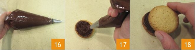 Passé ce temps, placez la crème dans une poche à douille avec une douille étoile de 6 mm de diamètre 16 et pressez-en une noisette sur le côté plat des biscuits 17. Refermez avec un autre biscuit, en gardant toujours le côté plat vers la crème 18.