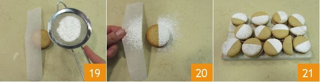 Pour finir, décorez les biscuits : posez une bande de papier sulfurisé sur la moitié de la surface et saupoudrez l'autre moitié découverte de sucre glace 19. Retirez délicatement le papier, vous obtiendrez ainsi un joli effet bicolore 20. Les biscuits au café sont prêts à être dégustés 21 !