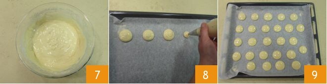La préparation sera plutôt crémeuse 7. Maintenant, tapissez une plaque de cuisson de papier sulfurisé, transférez la pâte dans une poche à douille avec une douille lisse de 10 mm de diamètre. Pressez des disques d'environ 3 cm de diamètre 8 en les espaçant, car ils s'étaleront légèrement à la cuisson. Avec ces quantités, vous obtiendrez environ 80 petits disques 9.