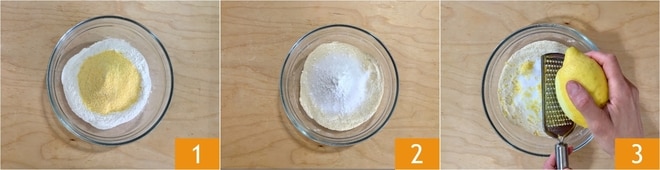 Pour réaliser les biscuits au citron sans beurre, versez dans un bol la farine 00, ajoutez la farine instantanée pour polenta (farine de maïs) 1 et mélangez. Ajoutez également le sucre 2, la levure chimique, le zeste râpé d’un demi-citron 3 et une pincée de sel.