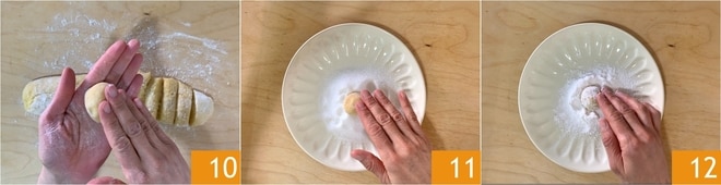 roulez-les dans la paume de votre main pour former de petites boules 10 et passez-les d'abord dans le sucre semoule 11 puis dans le sucre glace 12.