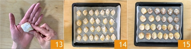 Écrasez la boule au centre avec vos doigts puis tirez les deux extrémités pour lui donner presque la forme d’un citron 13. Disposez les biscuits sur une plaque recouverte de papier sulfurisé 14 et faites cuire dans un four statique préchauffé à 180° pendant environ 12 minutes. Une fois cuits, ils seront dorés en surface et bien cuits dans la partie inférieure, sortez-les du four et laissez-les refroidir 15.
