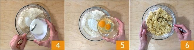Mélangez pour homogénéiser tous les ingrédients. À ce stade, ajoutez le yaourt au citron 4 et deux œufs 5, mélangez avec une cuillère pour les incorporer 6.