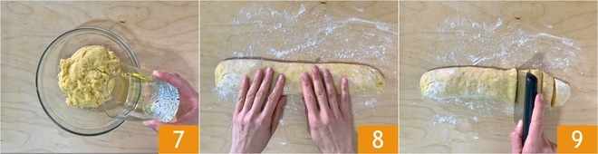 Enfin, versez l'huile de maïs 7 et pétrissez directement dans le bol. Vous devez obtenir une pâte souple et légèrement collante, transférez-la sur un plan légèrement fariné et formez un boudin 8. Découpez 26 morceaux d'environ 25 g 9,