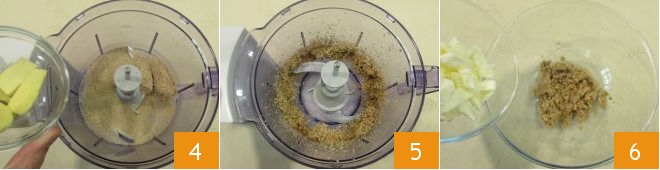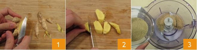 Pour réaliser les biscuits au gingembre, commencez par peler le gingembre avec un couteau 1, puis coupez-le en morceaux 2. Dans le bol d'un mixeur, versez la farine de noisettes, le sucre de canne 3