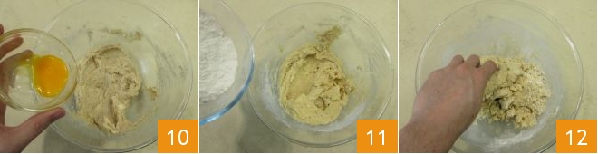 Versez dans la pâte amalgamée le jaune d'œuf 10, mélangez à nouveau, puis incorporez en deux temps la farine, de cette façon il sera plus facile de l'amalgamer au reste de la pâte 11, commencez à pétrir à la main 12