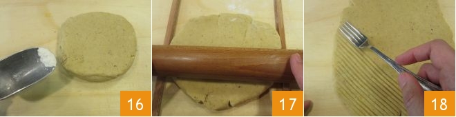 Une fois le temps de repos écoulé, reprenez la boule, déposez-la sur un plan de travail et saupoudrez-la de peu de farine 16, en plaçant de chaque côté des règles de 1 cm de hauteur qui vous aideront à obtenir la bonne épaisseur (si vous ne les avez pas, essayez tout de même d'atteindre l'épaisseur indiquée), étalez ensuite la pâte avec un rouleau à pâtisserie 17 jusqu'au niveau des règles. Passez le dos d'une fourchette sur la pâte pour donner un motif rayé avec les dents 18,