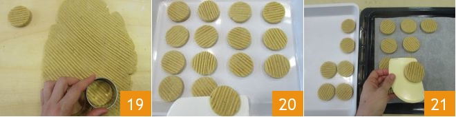 puis avec un emporte-pièce de 6 cm de diamètre, découpez les biscuits 19. Pétrissez à nouveau la pâte restante pour réaliser d'autres biscuits : avec ces quantités, vous en obtiendrez 18. Au fur et à mesure que vous réalisez les biscuits, déposez-les sur un plateau en vous aidant d'une spatule pour ne pas trop chauffer la pâte 20, puis laissez-les raffermir au réfrigérateur pendant 10-15 minutes, de cette manière ils garderont leur forme à la cuisson. Passé les 10-15 minutes, sortez le plateau du réfrigérateur et transférez les biscuits sur une plaque recouverte de papier sulfurisé 21.