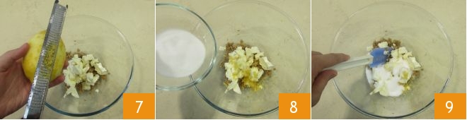 Parfumez avec le zeste de citron 7, ajoutez également le sucre 8 et mélangez le tout avec une spatule 9 pour amalgamer les ingrédients.