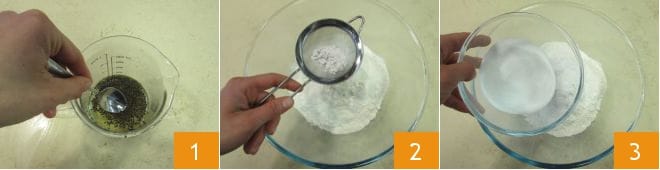 Pour préparer les biscuits au vin, commencez par mettre les graines d'anis dans le vin blanc, mélangez 1 et réservez. Dans un bol, versez la farine tamisée avec la levure 2, une pincée de sel et le sucre 3.