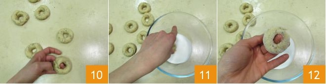 Enroulez-le en joignant les extrémités, faites bien adhérer 10. Vous pouvez maintenant plonger la petite couronne dans le sucre 11, seulement d'un côté 12. Continuez de la même manière pour tous les autres, vous obtiendrez environ 40 biscuits.