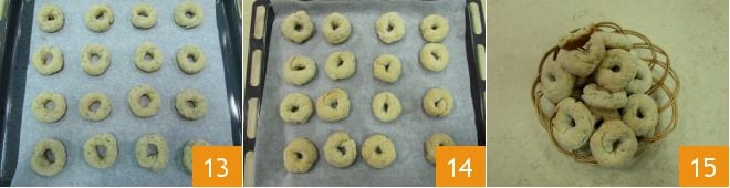Disposez au fur et à mesure les couronnes sur une feuille recouverte de papier sulfurisé, avec la partie sucrée vers le haut 13. Faites cuire dans un four statique préchauffé à 180°C pendant environ 25 minutes. Ensuite, sortez vos biscuits au vin du four 14, laissez-les refroidir avant de les servir 15.