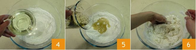 Mélangez à la main puis créez un puits, où vous pourrez verser l'huile 4 et le vin avec les petites graines d'anis 5. Pétrissez à la main 6