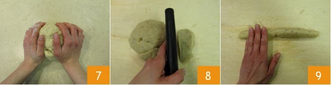 et une fois que vous aurez rassemblé tous les ingrédients, passez sur un plan de travail. Compactez bien la pâte 7 puis détachez un petit morceau à la fois, d'environ 28 g 8, réchauffez-le en le travaillant entre les paumes des mains puis formez un boudin d'environ 20 cm 9.