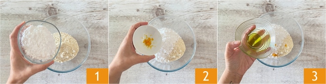 Pour préparer les biscuits aux amandes, versez dans un bol la farine d'amande, le sucre glace 1, le zeste d'orange râpé 2 et les blancs d'œufs 3.