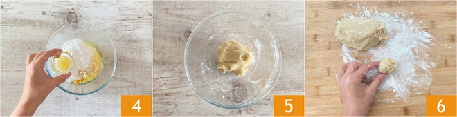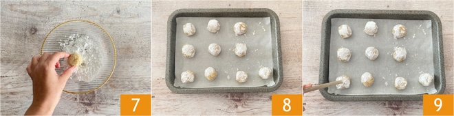 Passez les biscuits aux amandes dans le sucre glace 7 et au fur et à mesure, placez-les sur une plaque recouverte de papier cuisson 8. Vous pouvez donner la forme de petites couronnes aux amandes en faisant un trou au centre avec le manche d'une cuillère en bois 9.