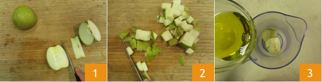 Pour réaliser les biscuits aux pommes sans beurre, commencez par laver les pommes, puis retirez le trognon 1 et coupez-en 130 g en dés d'environ 1 cm 2. Coupez le reste des 130 g de pommes en morceaux plus grossiers et placez-les dans le verre haut d'un mixeur, versez l'huile 3.
