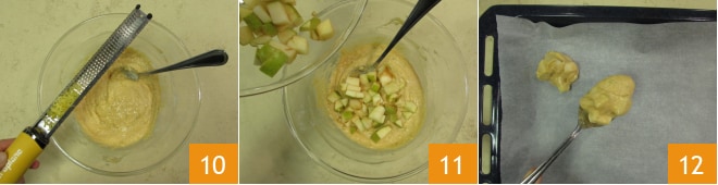 Parfumez la pâte avec le zeste de citron 10 et ajoutez les dés de pomme 11, mélangez à nouveau pour amalgamer. Tapissez une plaque de cuisson de papier sulfurisé et déposez des tas de pâte de la taille d'une noix en vous aidant d'une cuillère 12.