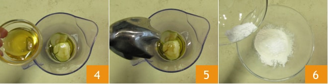 Ajoutez le miel 4 et mixez le tout jusqu'à obtenir un mélange homogène 5. Dans un bol, versez la farine, la levure 6,