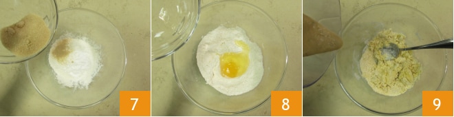 le sucre 7 et l'œuf 8. Mélangez avec une cuillère, puis incorporez également la pomme mixée 9.