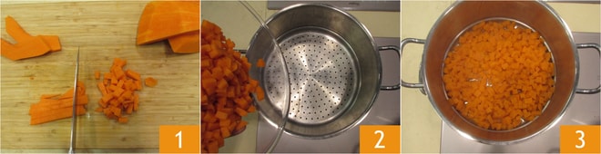 Pour réaliser les biscuits bicolores cacao et potiron, préparez d'abord le potiron. Épluchez-le et coupez-le en dés 1. Faites-le cuire à la vapeur 2 jusqu'à ce qu'il devienne tendre 3.