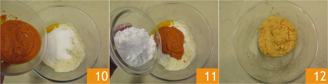 Ajoutez également la pulpe de potiron 10, la fécule de pomme de terre 11, le sucre et pétrissez 12.