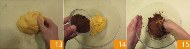 Vous devez obtenir une pâte homogène 13. Divisez la pâte en deux parts égales. Gardez-en une telle quelle et dans l'autre ajoutez le cacao 14. Travaillez pour bien mélanger 15.