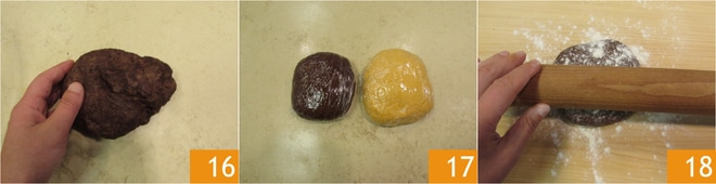 Vous obtiendrez ainsi une pâte sombre 16. Couvrez les deux pâtes avec du film plastique 17 et laissez reposer au réfrigérateur pendant 30 minutes. Une fois le temps écoulé, étalez la pâte sombre à une épaisseur d'environ 4-5 mm 18.