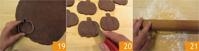 Découpez 20 biscuits avec des emporte-pièces en forme de potiron d'environ 7 cm 19. Avec un petit couteau, faites des incisions 20. Étalez maintenant de la même manière la pâte claire 21.