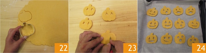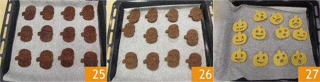 Découpez également ici 20 biscuits avec le même emporte-pièce 22. Avec un petit couteau, incisez les yeux et la bouche 23. Disposez les biscuits clairs 24